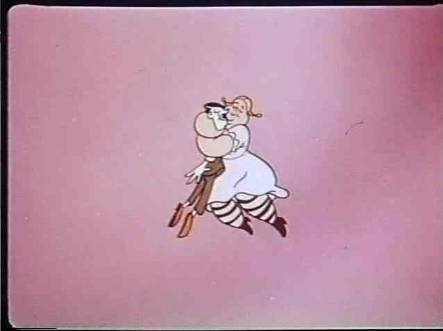 Comments: I do not have all the video to view of this cartoon. It is about Hitler. So I guess it got un-/less used in tv, so now we have an issue. We've got the audio tho. Lot of trash talking in the beginning of the cartoon. Hitler is voiced by the Goofy narrator. Hitler marries a zoftig Gunhild type. Hitler is ghostly pale. They reproduce; the honeymoon has the sound of gunshots. 2 of the kids (one of whom looks like a young George Liquor) imprison/kill the kid who disagrees. There's lots of fake German (I think; but it could just be very accented English, like the stuff I can understand). Everyone is saying the Nazi wallpaper won't stick (or at least that "he will never make it stick"). Then it just goes on in a fevered way, and some ends up sticking on a pig. It's confusing and unpleasant. Why is Hitler in high heels with a beret and a cigarette?